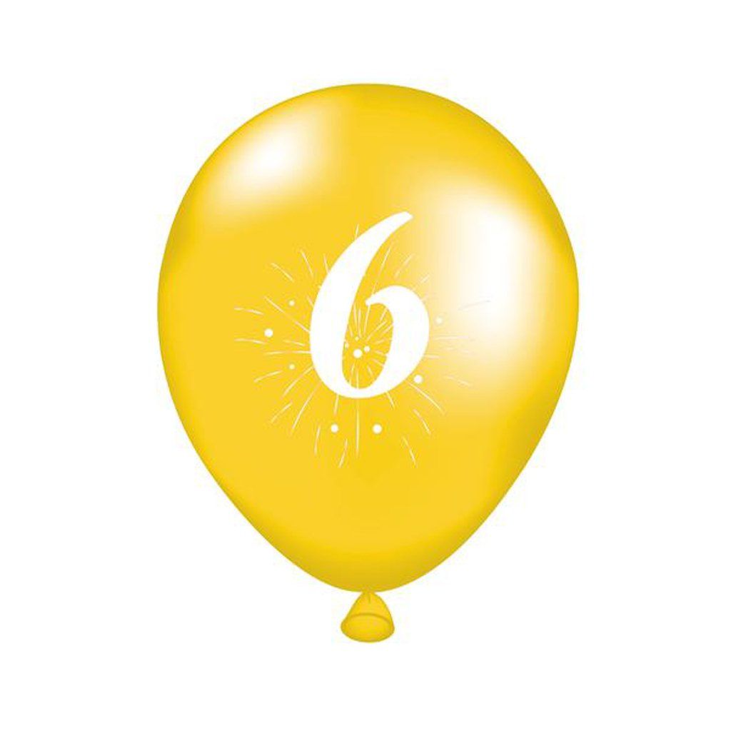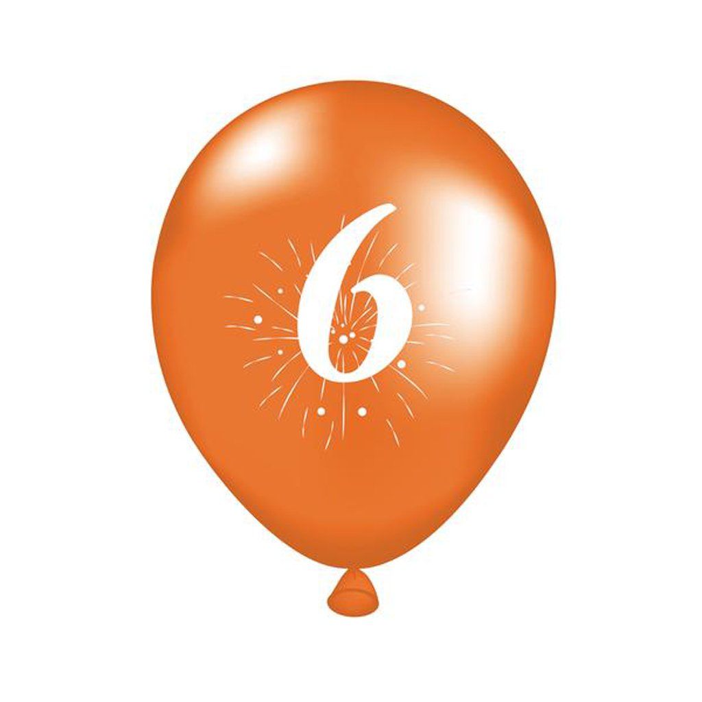 Party balónky s potiskem číslice "6" jsou vhodné na oslavu narozenin či různých výročí. Balení obsahuje 5 ks balónků (2x oranžový, 2x zelený, 1x žlutý o rozměru cca 25 cm (po nafouknutí). Balónky nafukujte pouze do přiměřeného rozměru. Manipulace dětí s balónky by měla probíhat pouze pod dozorem dospělé osoby. Skladujte při teplotách nad 10°C. Vyrobeno z přírodního latexu.Doplňkové parametry