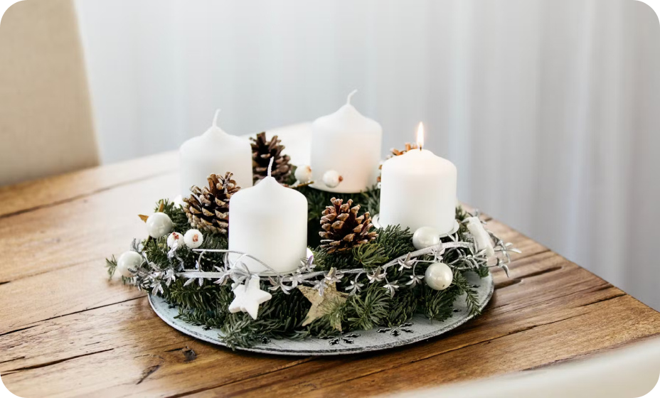 Bezpečnost: nikdy nenechávejte hořící svíčky bez dozoru. Pokud je věnec na stole, použijte ochrannou podložku.