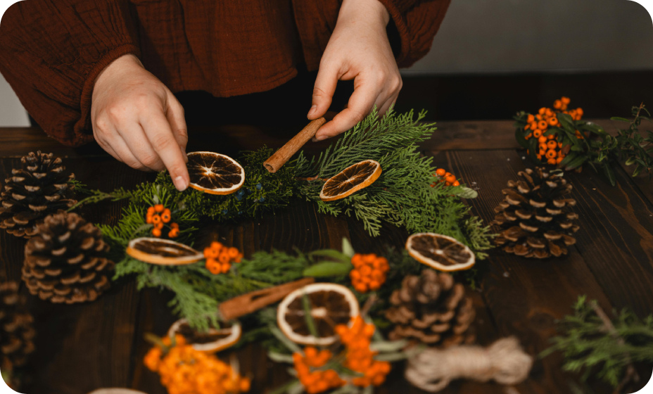- sady dekorací: sušené ovoce, mašle, šišky.