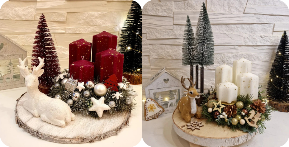 Postup: Špalek očistěte a případně ošetřete lakem pro delší trvanlivost. Odstraňte případné ostřejší výstupky ve spodní části, aby nedošlo k poškození stolu. Na špalek nalepte svíčky rovnoměrně, aby byl vyvážený. Na věnec lze umístit i čtyři malé svícny na čajové svíčky. Tavnou pistolí následně připevněte dekorace podle svého vkusu. Dbejte na to, aby dekorace byly dostatečně daleko od plamene svíček. Přidejte drobné detaily, jako jsou hvězdičky nebo malá vánoční ozdoba.