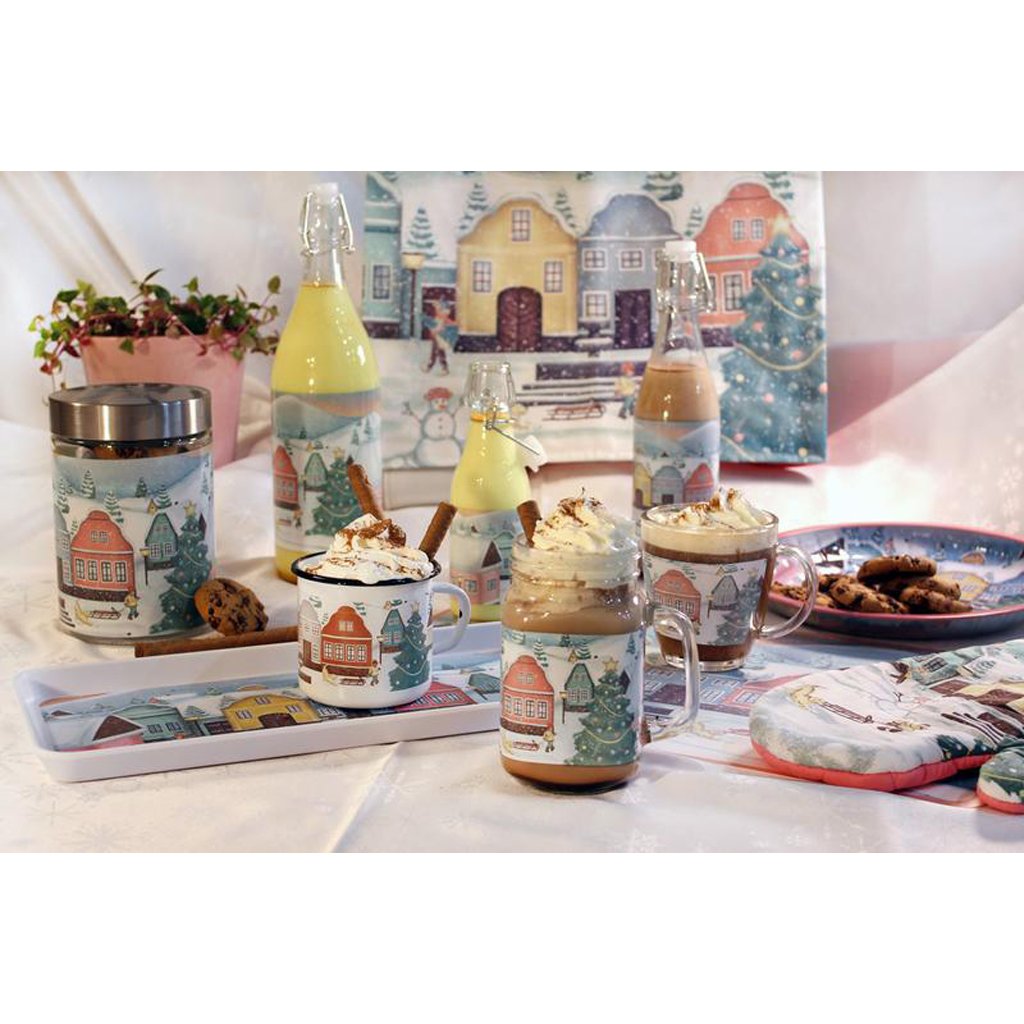 Skleněná dóza TORO o objemu 1100ml s originálním vánočním motivem vesničky. Díky krásnému elegantnímu motivu dózu lze používat na upečené cukroví, které bude ochráněno a zároveň stále na očích. Kovové víčko má těsnění a perfektně ochrání uskladněné potraviny. Své využití ale najde celoročně na sypké potraviny, těstoviny, oříšky, luštěniny a mnohé další