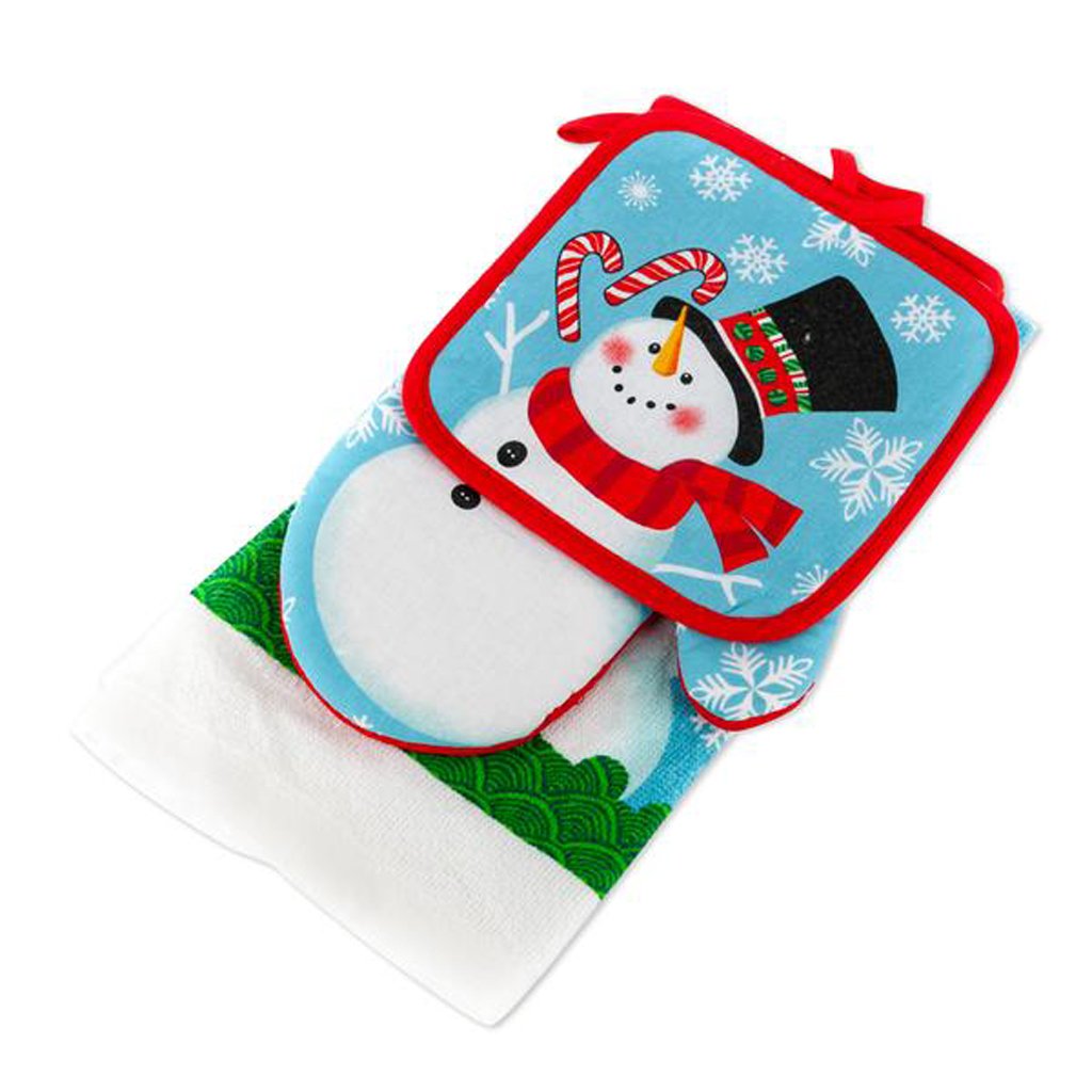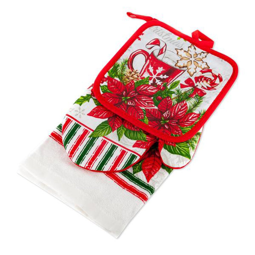 Rukavice bezpečně ochraňuje ruce, chňapka může sloužit i jako praktická podložka pod horké pekáče, a utěrka doplní každodenní používání i sváteční chvíle. Set je ideální na vánoční pečení i zimní přípravy – připravený pro domácí cukroví, kakaové odpoledne či sladké posezení.