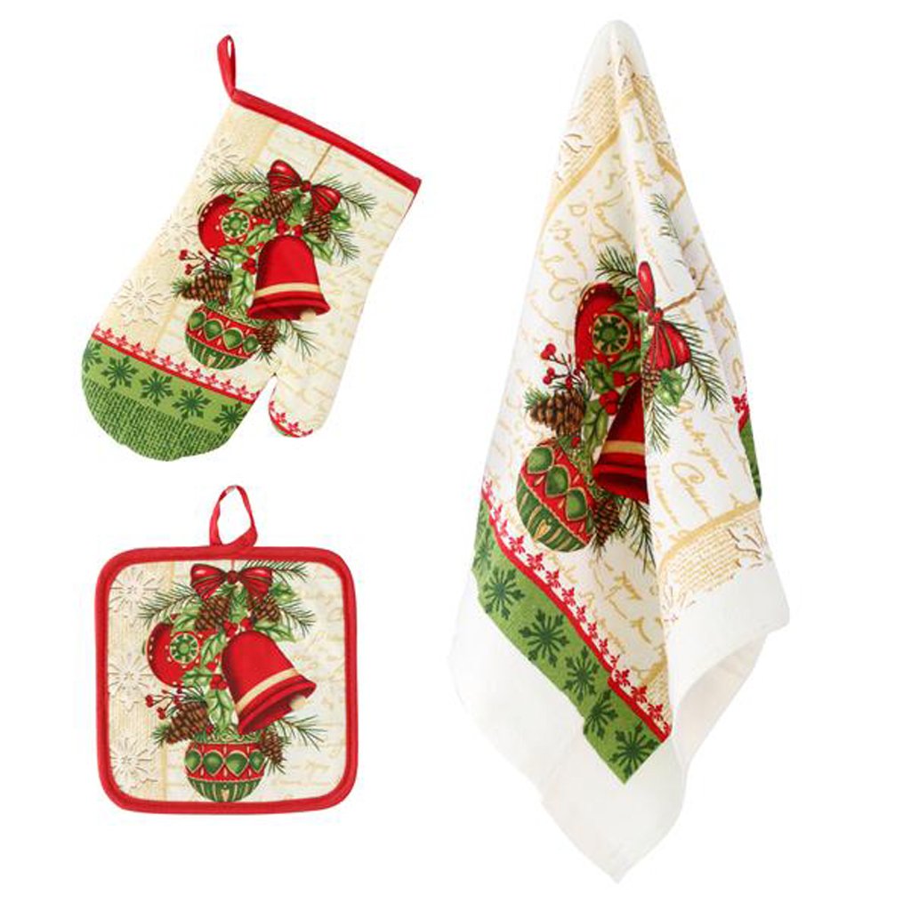 Tento vánoční kuchyňský set (utěrka, chňapka, rukavice) nabízí variabilitu dekoru v řadě jemných nebo výraznějších vánočních motivů – od tradičních vzorů až po současné stylizace. Vše vyrobeno z prvotřídního materiálu - 100% bavlna - materiál příjemný na dotek, odolný a snadno udržovatelný. Každý set vám umožní sladit kuchyňské textilie s vaší vánoční výzdobou – a vytvořit tak prostředí, ve kterém se pečení, vaření i prostírání stanou radostí.