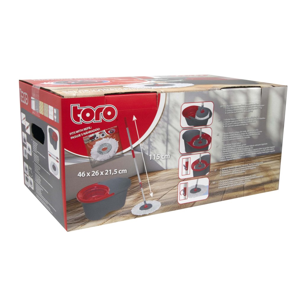 Rotační ždímací systém umožňuje regulovat vlhkost mopové hlavice podle typu podlahy – kratší odstřeďování ponechá více vlhkosti pro silnější znečištění, delší rotace zajistí téměř suché vytírání vhodné pro citlivější povrchy. Mikrovláknovou hlavici je vhodné pravidelně vyjmout, vyčistit a důkladně usušit, aby si zachovala maximální savost i čisticí schopnosti, a díky její vyměnitelnosti lze snadno dokoupit náhradní hlavici TORO (art. číslo 420076) bez nutnosti pořizovat celý nový mop.