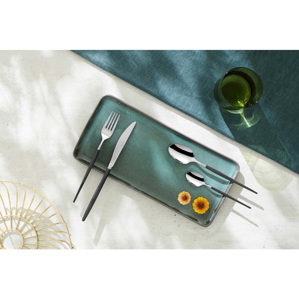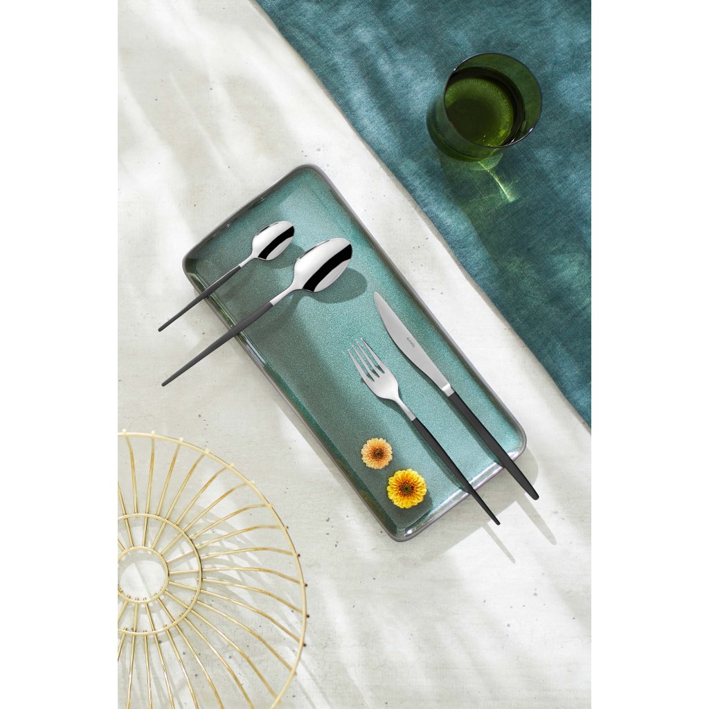 Příbory Soprano jsou důkazem, že elegance může mít i moderní tvář – odvážná, stylová, a přesto praktická. V rámci kompletního stolování se skvěle kombinují s jednobarevným porcelánem, čirým sklem nebo světlým prostíráním, které nechá jejich tmavý tón vyniknout. Tato sada není jen o jídle – je o vzhledu, který z obyčejné večeře udělá výjimečný moment.