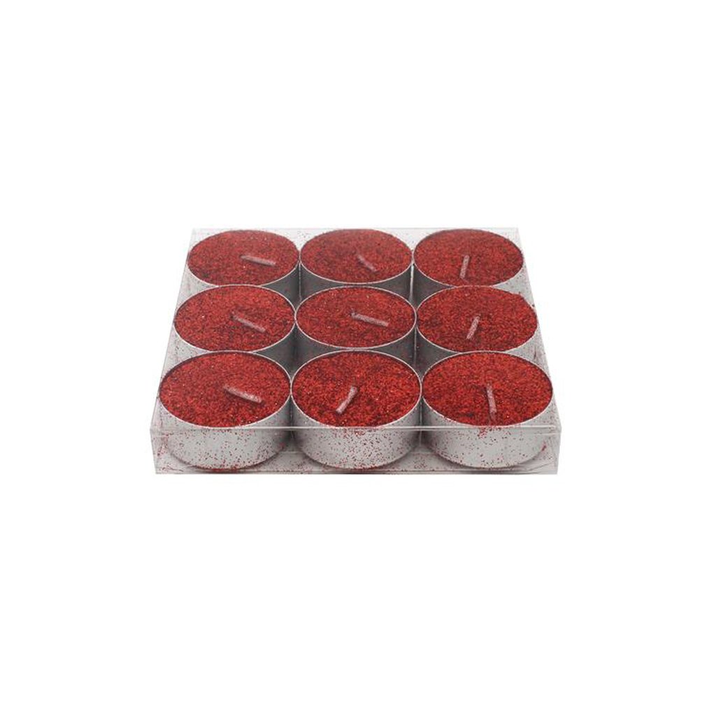 Barva červená, třpytivý design. Sada 9 ks. Doba hoření: cca 4 hodiny.